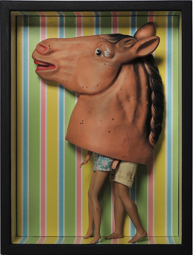 An assemblage of mixed materials, Giddy-Up uses the horse as a humorous symbol of power and sexual virility. The figures are in what might be construed as a sexual tryst, or perhaps an exploration of animal instincts. Partly hidden, the figures elicit the possibile interpretation that their adventures are of an anonymous nature.