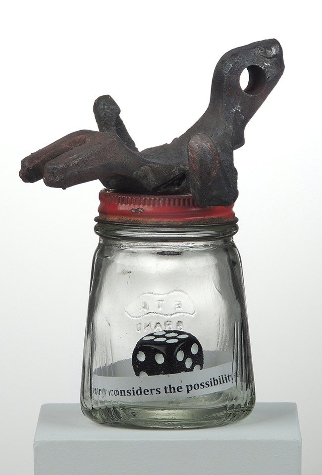 Assemblage of mixed materials: welded iron, glass jar, dice, and a text that reads "Henry considers the possibility of slipping over.